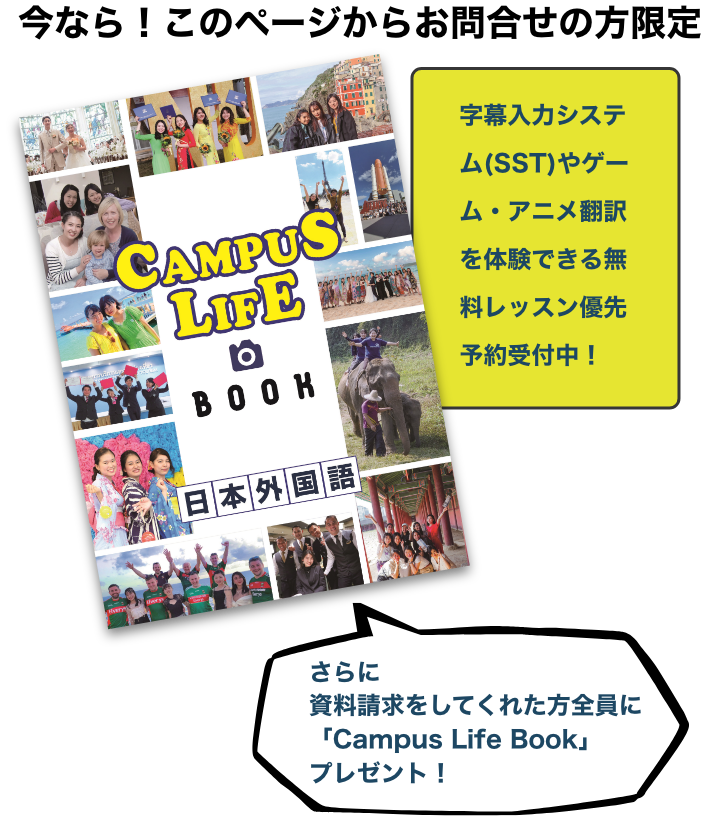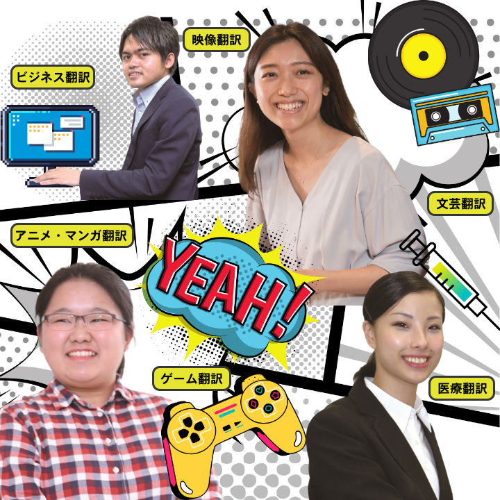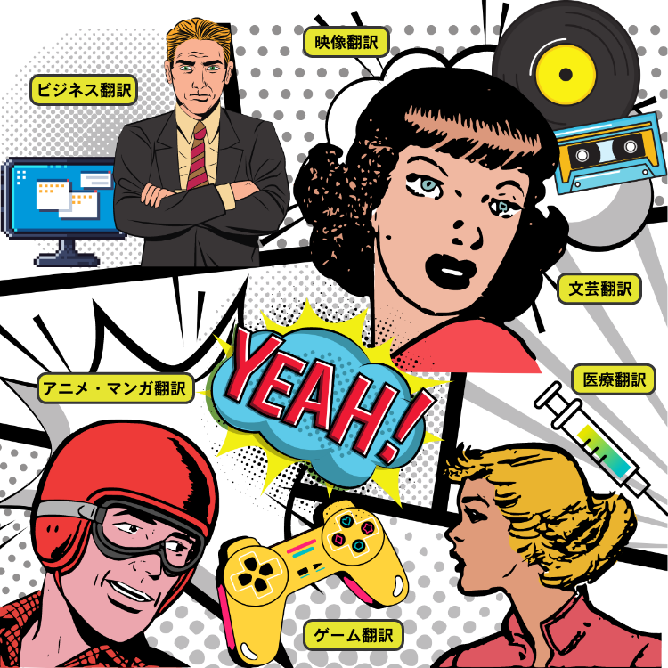 映像翻訳・ゲーム翻訳・アニメ/マンガ翻訳・文芸翻訳・実務翻訳、全てを授業として学べるカリキュラムはJCFLだけ!